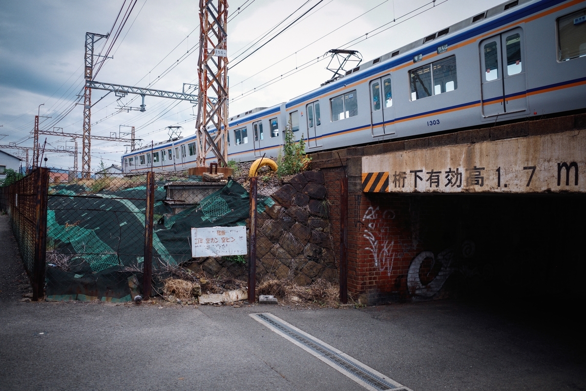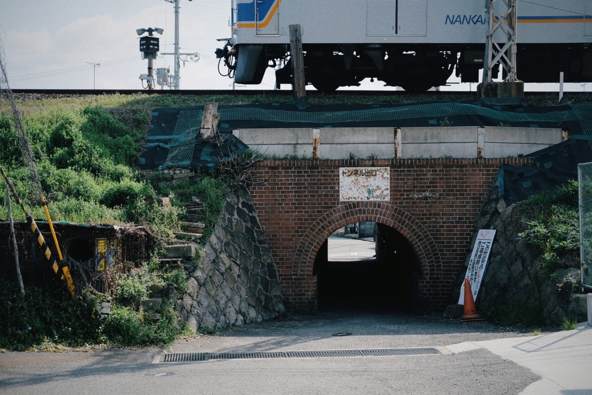 南海和歌山市駅を出た電車は紀の川を渡るために、工場手前から緩やかな登り勾配になっており、このような低いガード下になっている。