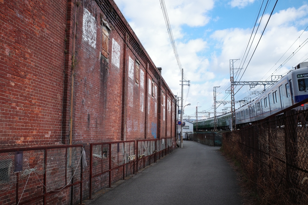 ガード下をくぐって線路を間に挟んで見る旧和歌山紡績紀の川工場。