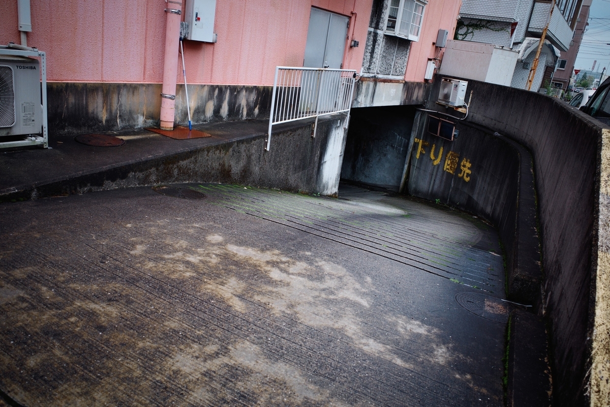 どうやら地下に駐車場があるようだが対向できないスロープ。