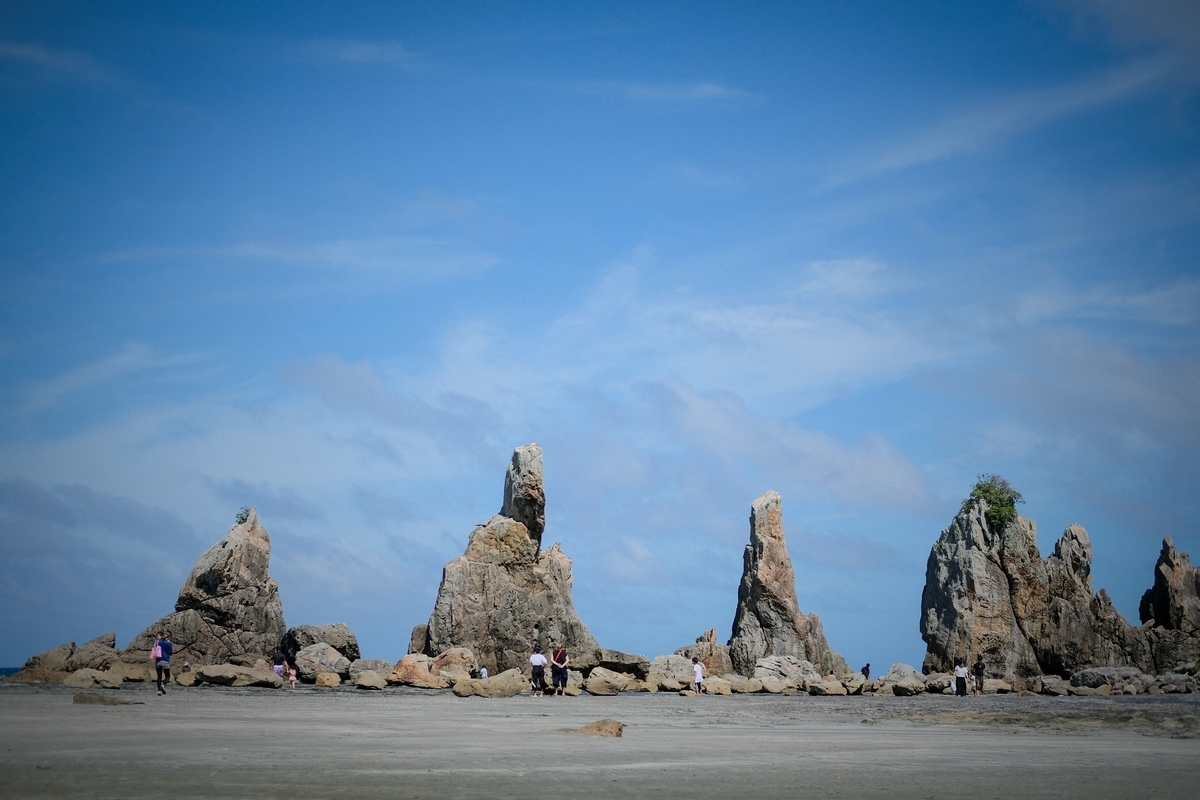 干潮時には橋杭岩の近くまで歩いて行く事ができますが、写真を撮るならやはり潮が満ちている時じゃあないでしょうか。