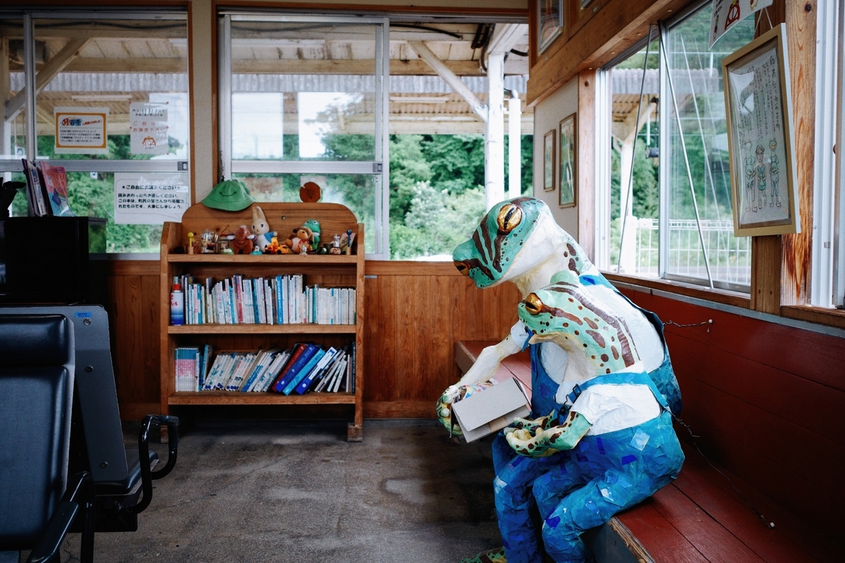 駅舎内にカエルが。