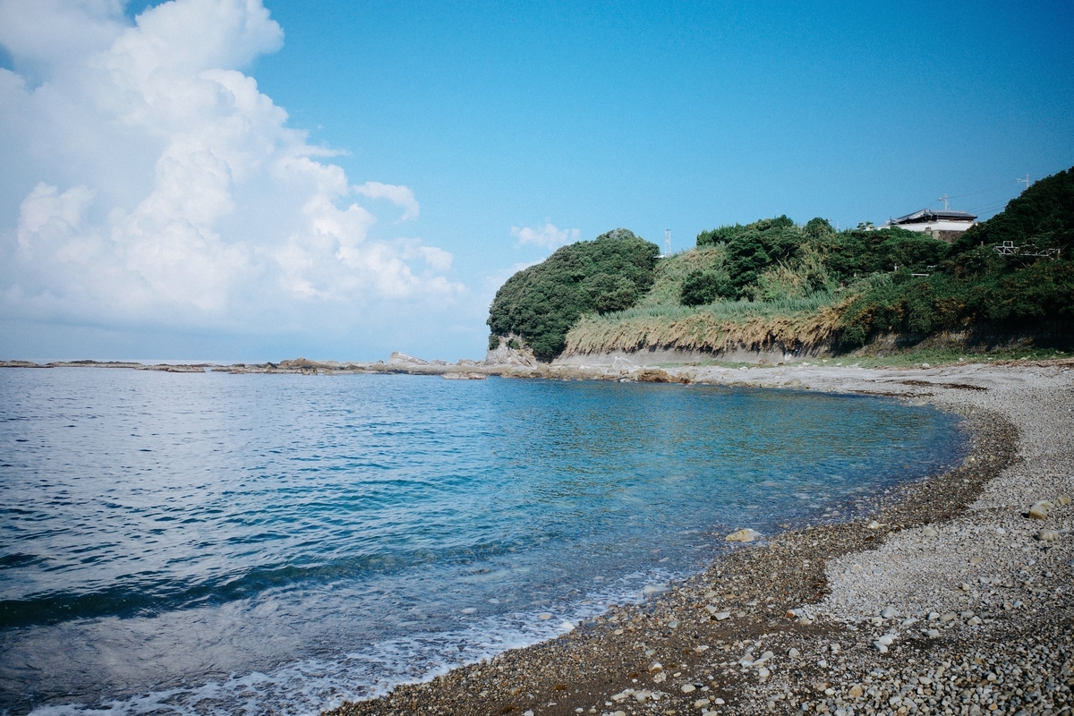 海岸は砂利浜で細かい石の場所と大きな石の場所がある。